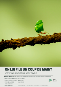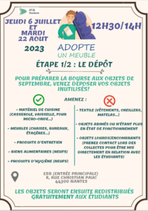 L‘événement ADOPTE UN MEUBLE (anciennement appelé Récup’et dons) consiste à collecter auprès des structures membres de l’AFUL Chantrerie des meubles, objets, équipements afin de les redistribuer aux étudiants de la Chantrerie lors des rentrées des établissements d’enseignements supérieurs en septembre. Le but est de donner (sans contrepartie) aux élèves des objets et meubles pour leur donner… Lire la suite : Adopte un meuble 2023 - Nettoyons la Nature 2024/2025
