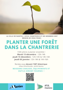 Envie de donner un coup de pouce à la Nature ? La ville de Nantes va planter 1500 plantes (arbres, arbrisseaux, plantes vivaces, etc.) sur les espaces verts de la Chantrerie. Avis donc aux volontaires qui souhaiteraient participer à cette 1ère plantation forestière sur la Chantrerie ! Lien pour se préinscrire - Nettoyons la Nature 2022/2023